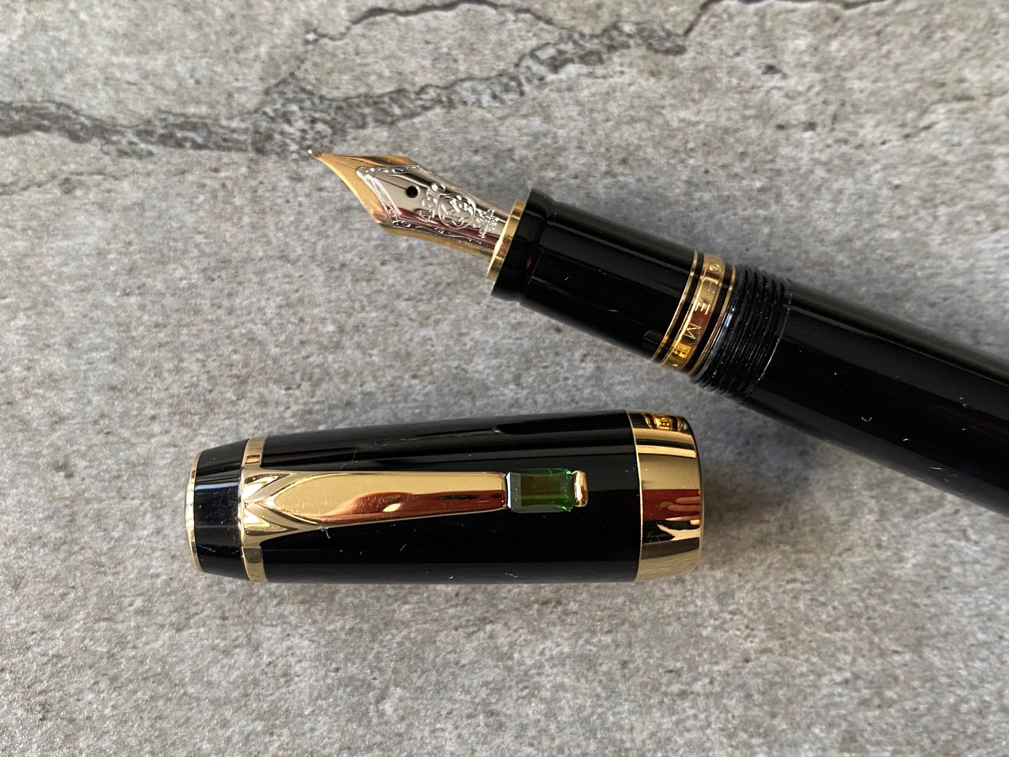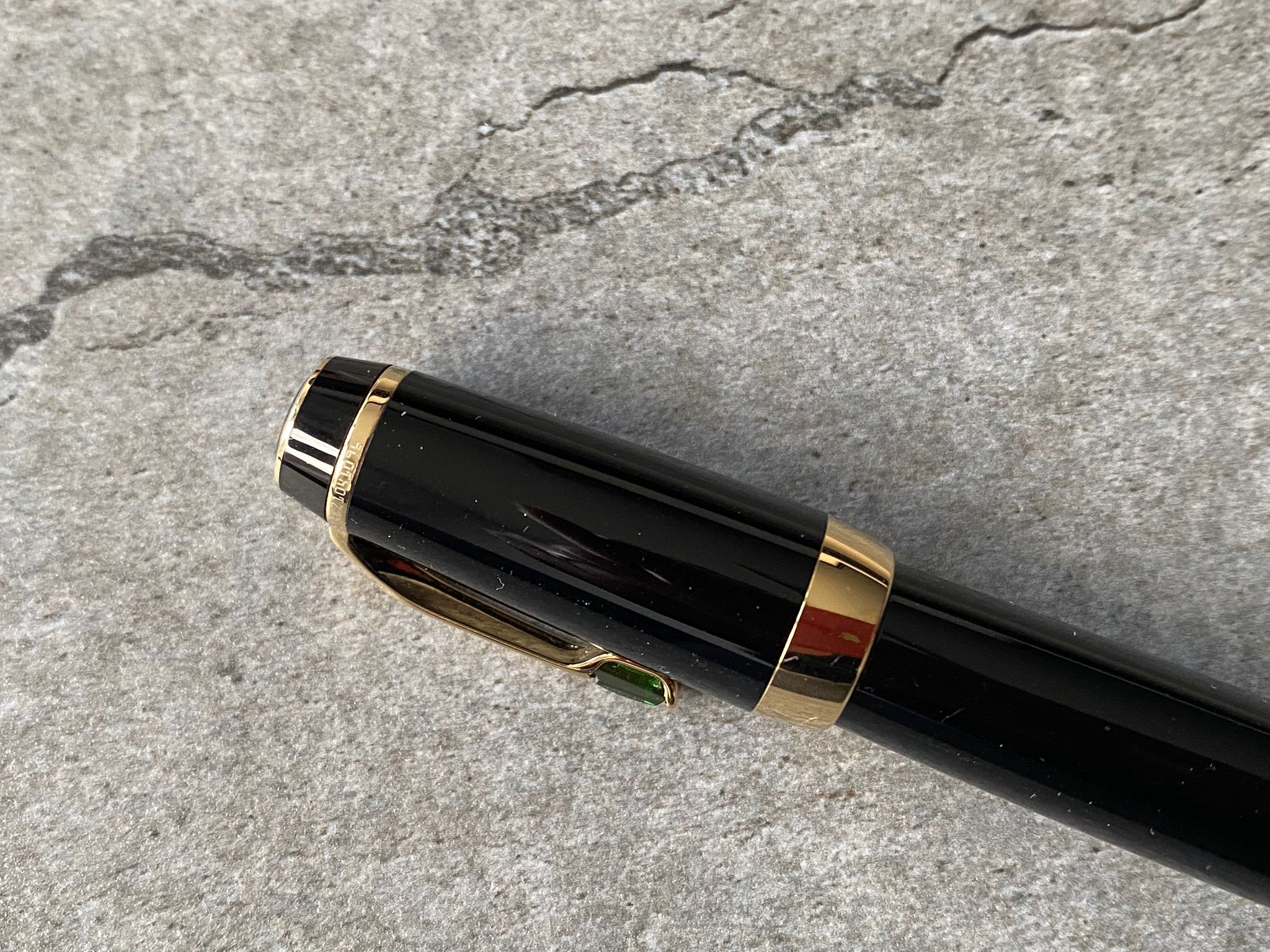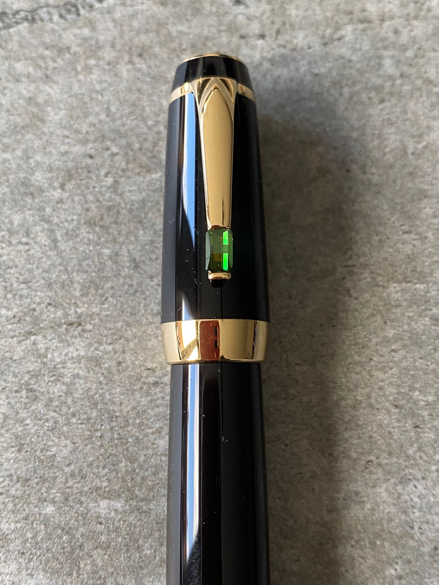Model: Gold plated trims and vert (green) gemstone fountain pen.