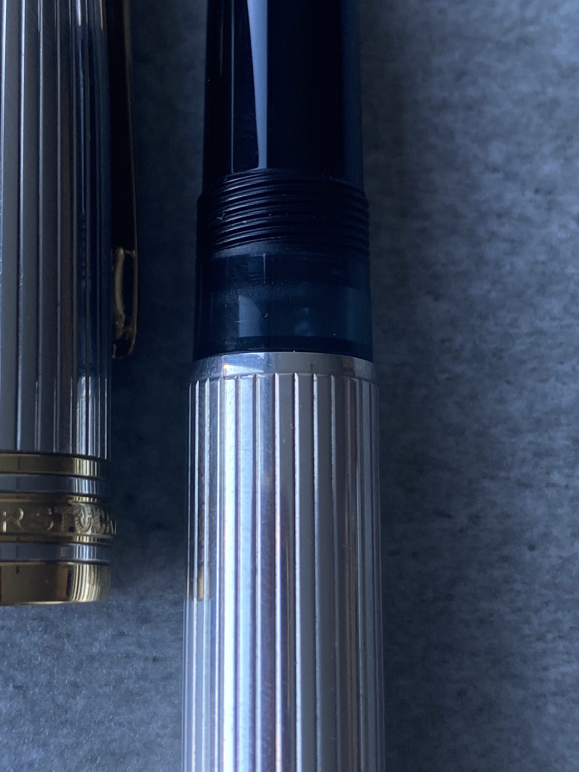 Model: Sterling Silver in pinstripe with the grey blue ink window and ebonite feed